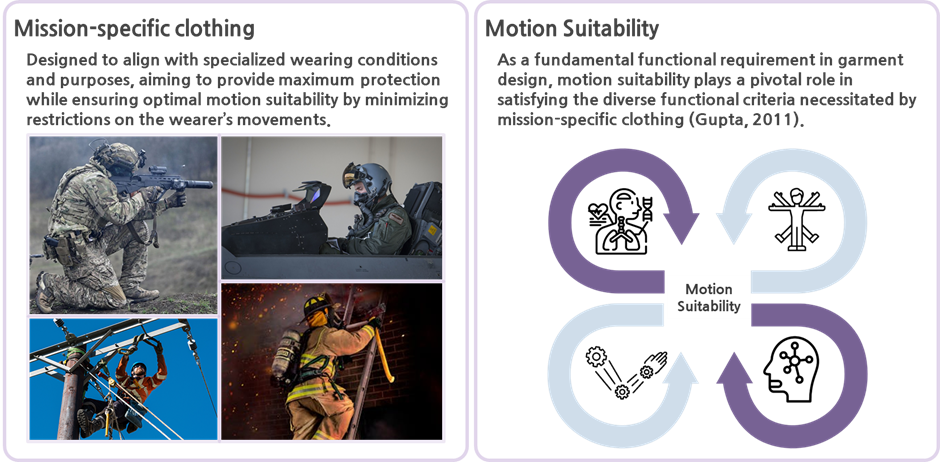 Mission-specific clothing refer to specialized garments designed to facilitate the seamless execution of tasks within specific operational environments. These suits, worn in high-risk and high-intensity sectors—such as defense, firefighting, healthcare, and disaster rescue—must integrate diverse functional requirements, including physiological, biomechanical, ergonomic, and psychological factors. In particular, motion suitability is not only a fundamental consideration in garment design but also plays a critical role in satisfying the various functional requirements of mission-specific clothing (Gupta, 2011).