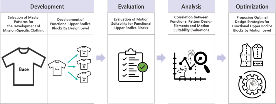 Traditionally, the development of these suits has been conducted through independent pattern designs for each case, tailored to specific mission environments and required movements. However, by analyzing the pattern design factors that influence motion suitability and establishing a systematic framework for functional pattern design based on motion levels, the efficiency of the mission-specific clothing development process can be significantly enhanced. This study developed and evaluated functional upper bodice blocks with varying design levels that can be applied universally to a wide range of mission-specific clothing. Based on these evaluations, this research presents an optimal design strategy for functional upper bodice blocks categorized by motion level to maximize motion suitability.
